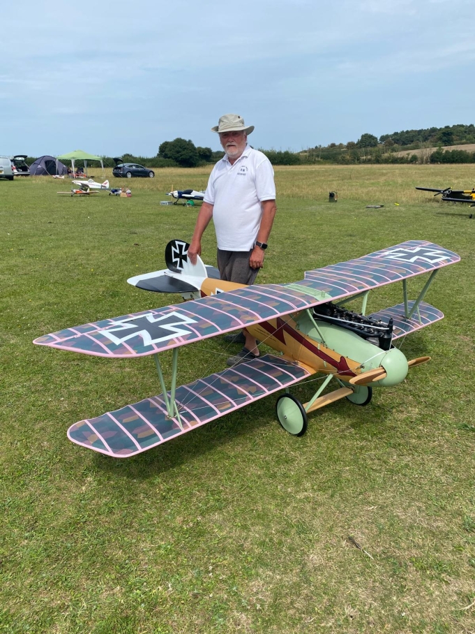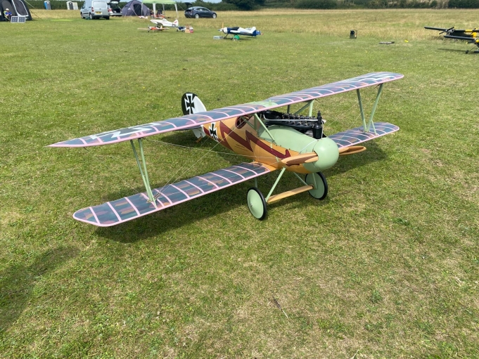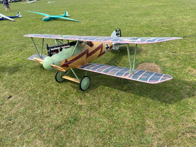 The covering is solartex with authentic lozenge pattern, the rib tapes are solartex painted rose pink, all crosses and nomenclature are painted on, no vinyl decals on this. The flying wires are bicycle gear cables and 3 mm turnbuckles, the dummy engine is scratch